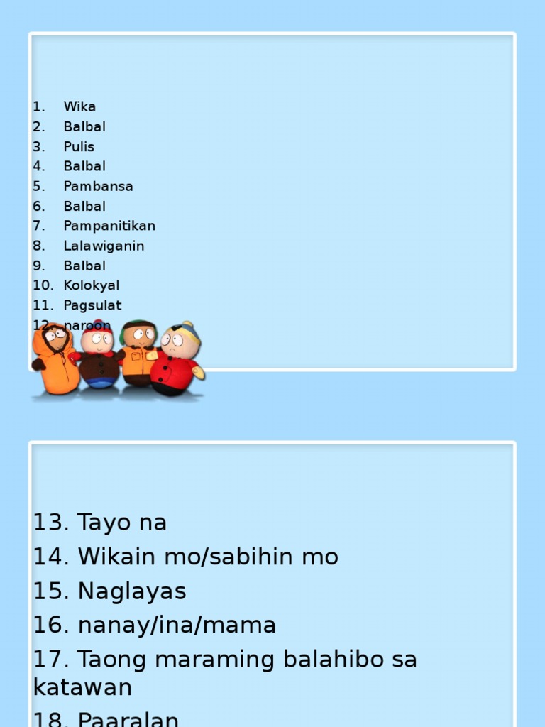 Tulad nang mabilis ngunit may impit o pasarang tunog sa hulihan laging nagtatapos sa patinig tuldik na pakupya. What are the differences between the musical instruments of Mindanao to the musical instrument from the Visayas. Halimbawa ng expository o paglabas ng katotohanan.