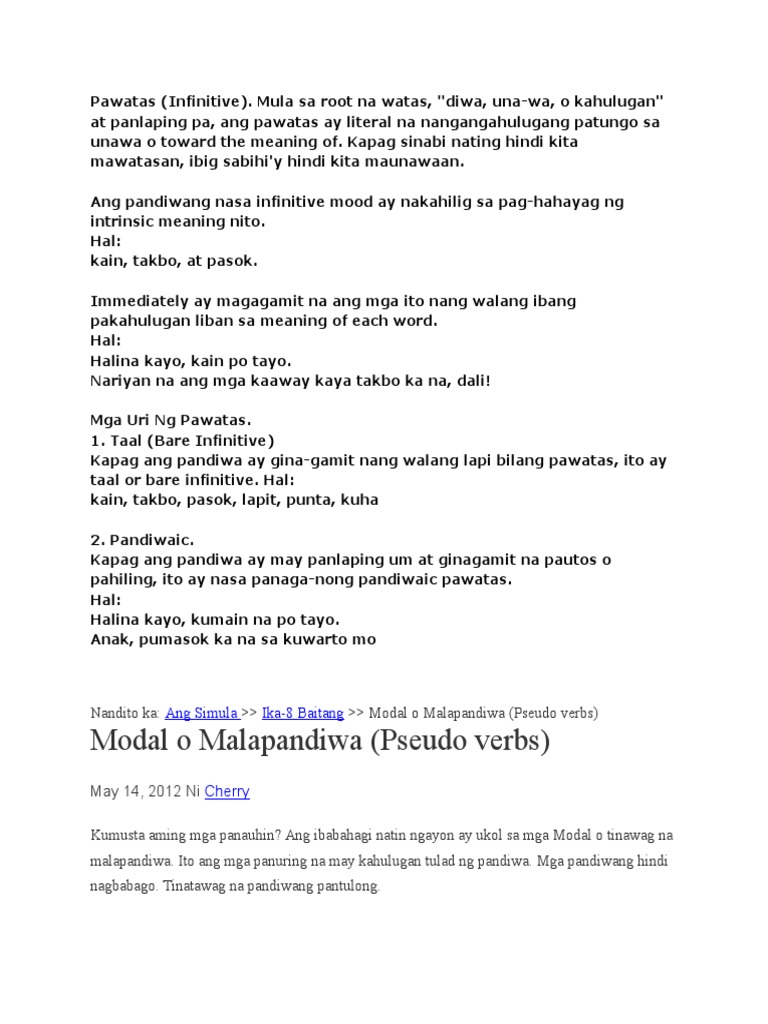 Banghayin ang pandiwang pawatas sa aspektong hinihingi sa ImperpektibKontemplatiboSalitang-ugatPerpektibo Katatapos1. Ang salitang-ugat at panlapi ang bubuo sa salitang pawatas na magiging batayang anyo ng pandiwa. Contextual translation of pandiwang pawatas.