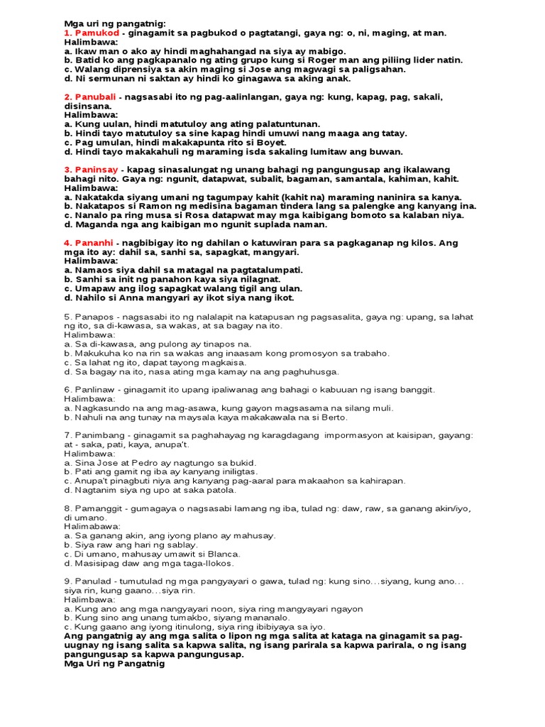 MGA URI NG PANGATNIG Tags. Ang panlinaw panubali paninsay pamukod pananhi panapos panimbang pamanggit panulad at pantulong.