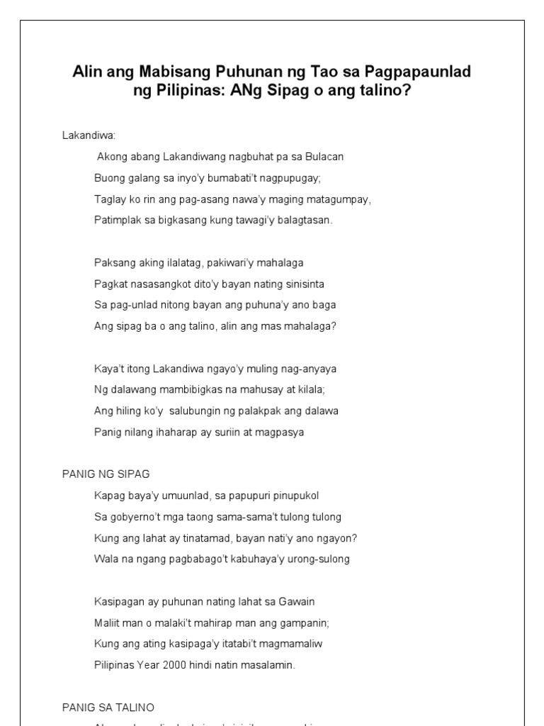 Paksang aking ilalatag pakiwariy mahalaga. Ang talino ang nagbubuklod sa pambansang kalayaan nagbibigkis sa damdamin makayaot makabayanLakandiwa. Ikinalulungkot kong sabihin ang hatol koy wala pa rin.