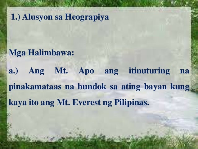 Halimbawa ng alusyon sa heograpiya. Pagtutulad Simile - Ito ay isang uri ng tayutay na lantaran ang paghahambing ng dalawang bagay tao pangyayari at iba pa. Aming sinisiguro ang pagserbisyo ng bago at pinaka-tinatangkilik na balita.