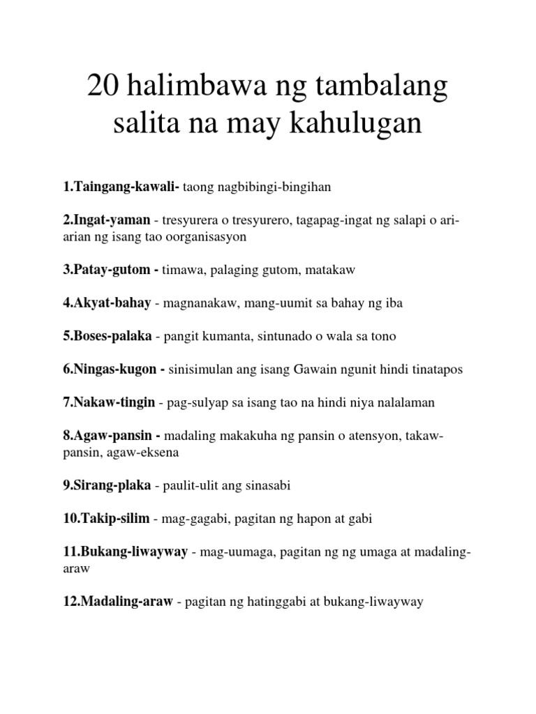 6 years 3 months ago. 08102020 Mga Halimbawa ng Tambalang SalitaExamples of Compound Words. 09032020 20 halimbawa ng tambalang salita na may kahulugan 1Taingang-kawali-taong nagbibingi-bingihan 2Ingat-yaman - tresyurera o tresyurero tagapag-ingat ng salapi o ari-arian ng isang tao oorganisasyon 3Patay-gutom - timawa palaging gutom matakaw 4Akyat-bahay - magnanakaw mang-uumit sa bahay ng iba 5Boses-palaka - pangit kumanta sintunado o wala.