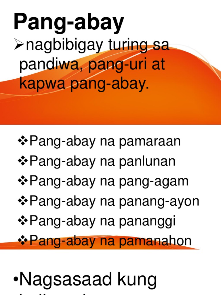 17072017 Piliin at bilugan sa panaklong ang tamang sagot1. In Filipino adverbs that express affirmation or agreement about the action expressed by a verb about the quality expressed by an adjective or about another adverb are called pang-abay na panang-ayon. PANG-ABAY PANGGAANO ay pang-abay ay nagsasaad ng timbang o sukat.