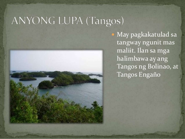 ANYONG LUPA Tangos May pagkakatulad sa tangway ngunit mas maliit. Peninsula cape promontory ay isang anyong lupa na napapaligiran ng tubig sa tatlong sulok. Peninsula cape promontory ay isang anyong lupa na napapaligiran ng tubig sa tatlong sulok.